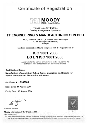 Certified for ISO 9001:2008 by Moody International on 11th August 2011.