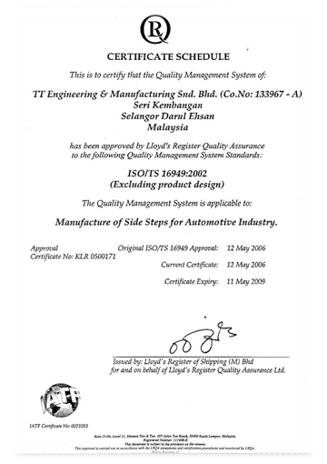 Accredited ISO / TS16949:2002 by LRQA on 12th May 2006, collaborated with Ford and Volvo as first tier supplier.